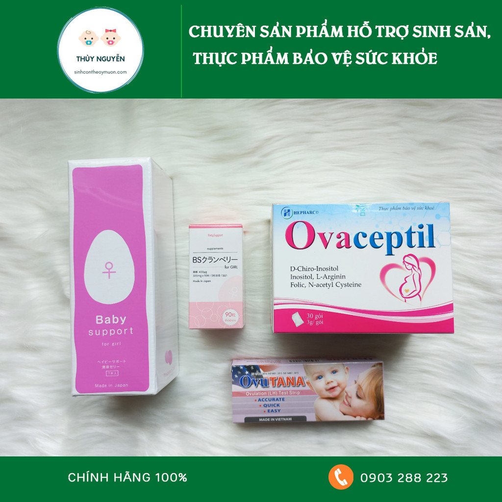 Combo 1 hộp viên uống tạo axit + 2 que Gel tạo axit Baby support + 2 hộp que thử rụng trứng + 1 Hộp Bổ trứng Ovaceptil - Hỗ trợ sinh bé gái