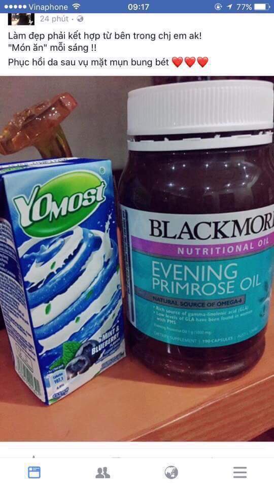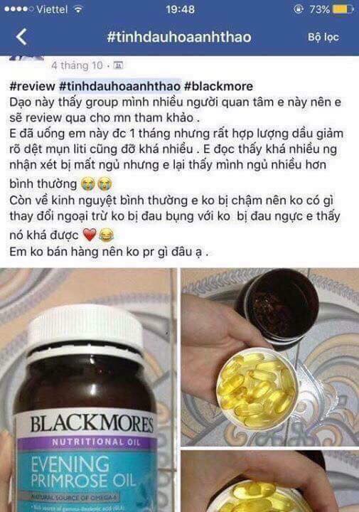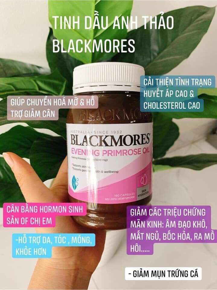 - EPO giúp Phụ nữ giảm các triệu chứng khó chịu thời kỳ tiền kinh nguyệt (PMS), kinh nguyệt như căng tức ngực, đau bụng, bụng đầy hơi, bồn chồn, ngứa da và sưng ngón tay. - - Evening Primrose oil của Blackmore giúp cân nội tiết tố của phụ nữ, đặc biệt với những phụ nữ sau sinh nhu cầu sinh lý giảm, nội tiết tố bị thay đổi,..
