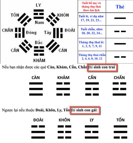 Như vậy dựa theo tuổi âm lịch của bố, mẹ kết hợp với tháng thụ thai bạn sẽ bốc được quẻ cho mình. Nếu bạn nhận được các quẻ Càn, Khảm, Cấn, Chấn thì sinh con trai.